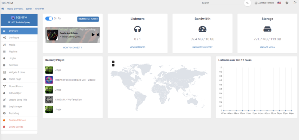 As soon as AutoDJ goes live, information will start feeding through. When a track changes, you will see this within seconds on the status and recently played tracks widgets. All data on this page is live and updated automatically including listener numbers, bandwidth, storage, the map and listeners over 12 hours.