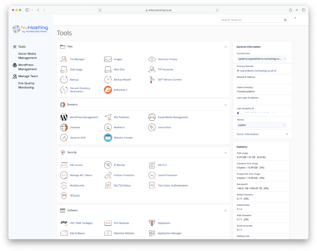 Besides WordPress, cPanel Hosting is also suitable for websites and apps built with HTML and PHP and which use other content management systems (CMS), like Joomla or Drupal. Though it doesn’t provide WordPress-specific optimisations, it does include essential features like email hosting, databases and FTP access.